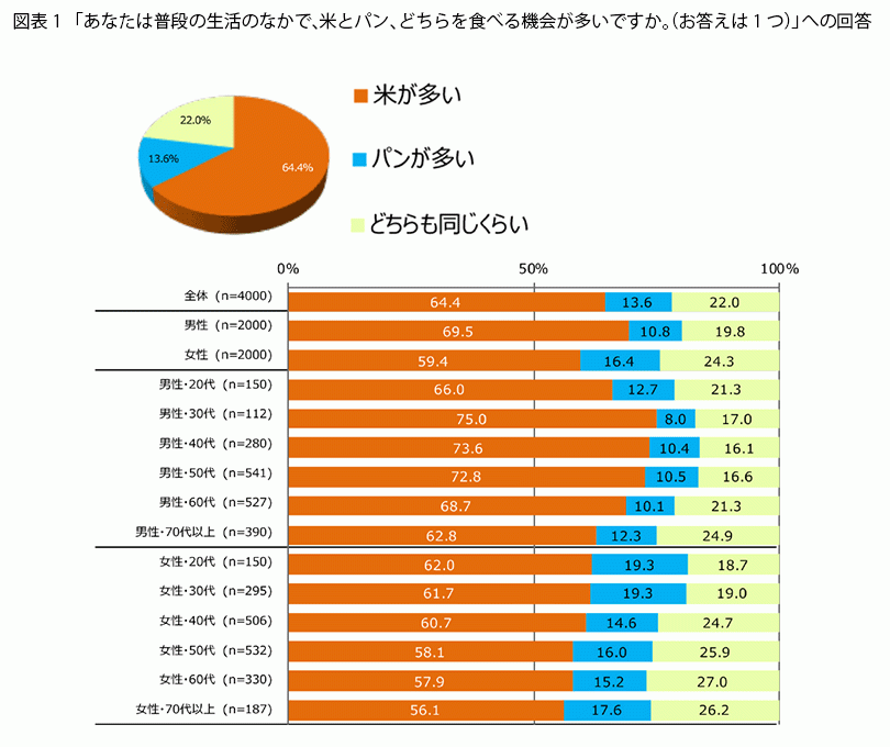 普段の生活のなかで、米とパン、どちらを食べる機会が多いかを聞いたところ(図表1)、「米が多い」と回答した人は全体で64.4%でした。