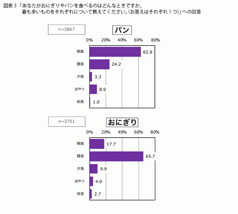 次に、どんなときにおにぎりやパンを食べるかを聞きました(図表3)。