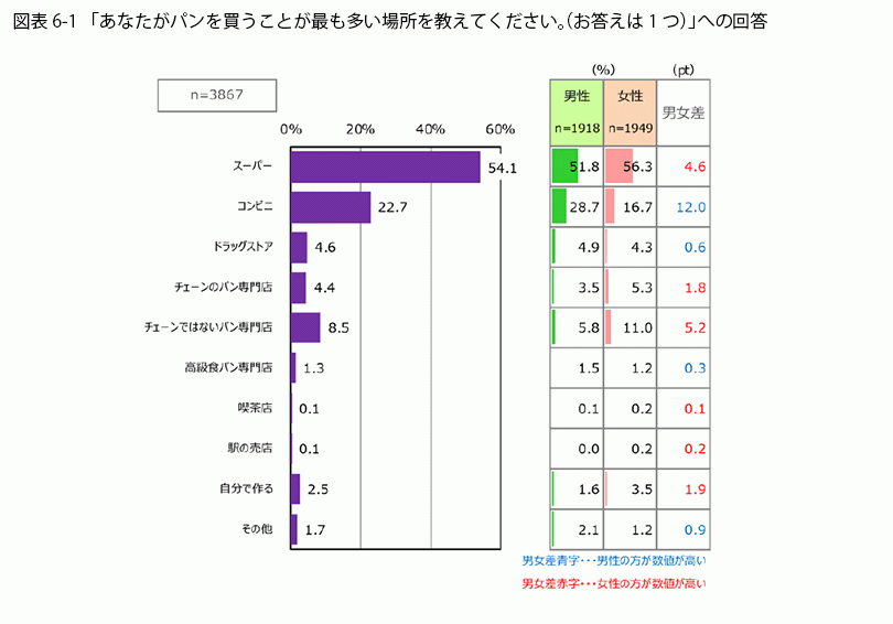 次におにぎりやパンをどこで買うことが多いかを聞きました。おにぎりについては(図表5)、もっとも多いのが「コンビニ」(57.2%)で、2位が「スーパー」(24.9%)でした。パンについては(図表6-1)、「スーパー」(54.1%)、「コンビニ」(22.7%)の順になっていて、おにぎりとパンで1位・2位が逆転しています。