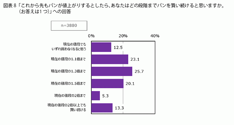 「これから先もパンが値上がりするとしたら、あなたはどの段階までパンを買い続けると思いますか」(図表8)と聞いたところ、最も多かったのは「現在の値段の1.3倍まで」(25.7%)でした。