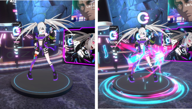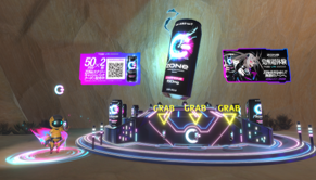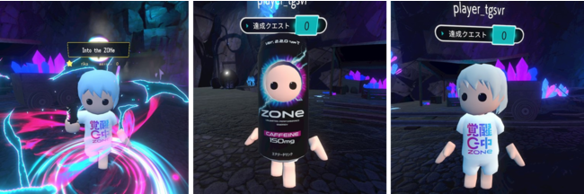 ZONeのブースとスポットでは、“無敵のゾーン状態“を体験することができます。設置されているZONe缶を掴むと、自分のアバターに覚醒エフェクトがかかり、TGSVRでしか体験できない無敵のゾーンへ没入することができます。また、QUARTZ AREA内のZONeエナジーのブースでクエストをクリアすると、「ZONeエナジー缶着ぐるみ」「ZONeエナジー覚醒中Tシャツ」のアイテムを手に入れることができます。