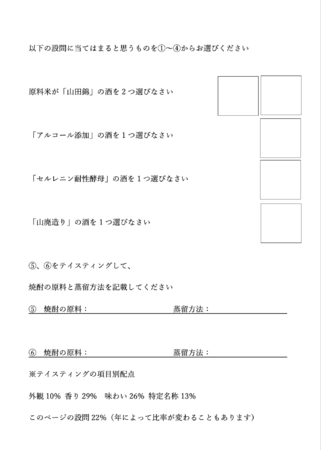 国際規格テイスティンググラスにて、日本酒を4種類、焼酎を2種類ブラインドで並べ、試験同様30分の時間制限を設けてテイスティングしつつ、試験さながらの設問に解答していただきます。