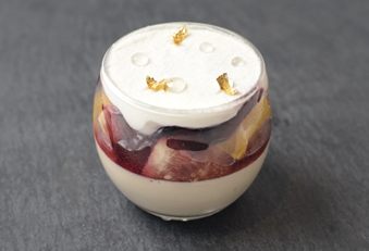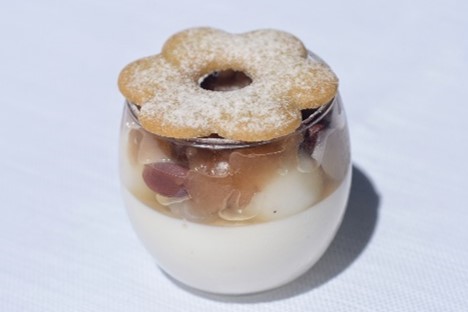 沖縄県ではおなじみの甘味「ぜんざい」を洋風スタイルにアレンジしました。ココナッツソースを閉じ込めたパンナコッタをベースに、沖縄ぜんざいゼリーに白玉だんごとライチをあしらい、こちらも沖縄ではおなじみの月桃を使用したサブレをのせました。ぜんざいのほど良い甘さと、ライチの爽やかさが見事にマリアージュされています。