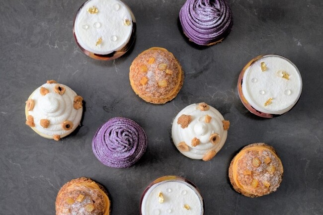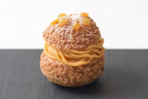 輝くような濃い黄色と「天然のスイーツ」と言われるほどの強い甘みが特徴の黄金(くがに)芋を使用したシュークリーム。クリームには、生クリームとカスタードクリームを混ぜ合わせたうえに、マーマレードをエッセンスとして加えることで濃厚で上品な味わいに仕上げました。パティシエのアイディアが際立つスイーツです。