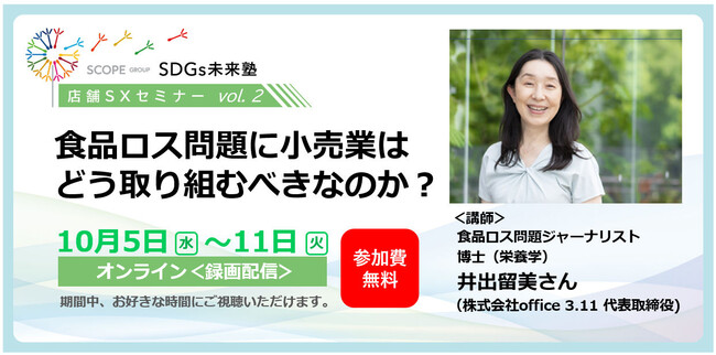 株式会社スコープは、来る10月5日に、オンラインにて、食品ロス問題ジャーナリストの井出留美様をお招きし、小売店舗における食品ロス問題に対する考え方、および先進的な世界の実践事例を紹介していただきます。今回の参加方法は録画配信にて期間中お好きな時間にご視聴いただけます。