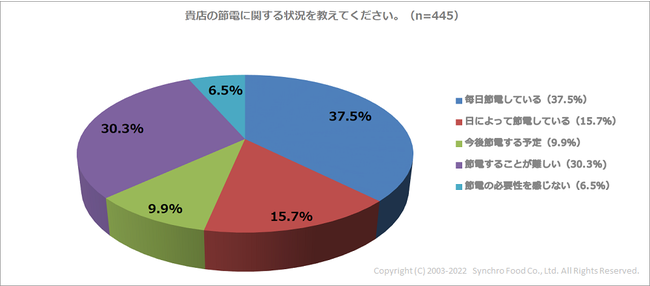 政府から7年ぶりの節電要請が出されるなど、近年電力不足が問題となっています。そこで店舗における節電事情を尋ねたところ、最も多かったのが「毎日節電している(37.5%)」との回答。「日によって節電している(15.7%)」との回答と合わせると、53.2%の店舗が何らかの節電を行っています。「節電することが難しい」との回答は、30.3%でした。なお、本アンケートの調査期間中は、政府から節電要請(7月1日~9月30日)が出されており、こうした背景も影響している可能性があります。