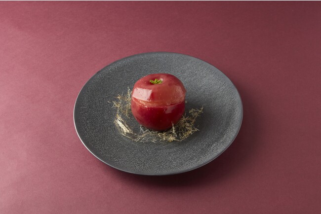 丸ごとコンポートにしたりんごの中は、“ズッパイングレーゼ”と焼きメレンゲ、りんごのジュレ。ズッパイングレーゼは、リキュールやシロップをたっぷり染み込ませたスポンジケーキとカスタードクリームを重ねたイタリアの伝統菓子です。