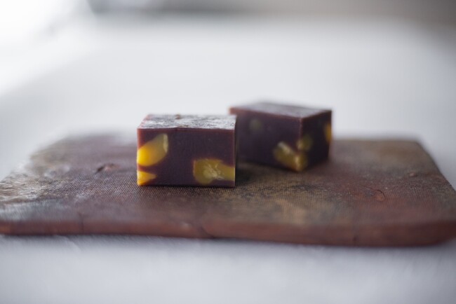 富士の枕詞・あまのはらを菓名とする羊羹は、切るたびに断面の富士山の景色が変わるのが特長。栗入りの秋バージョンは、切るたびに富士山が紅葉に染まってゆくデザインです。