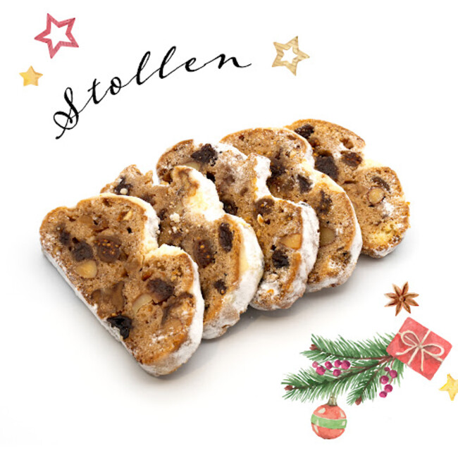 ドイツの伝統的なクリスマスの菓子パン。ブランデーに漬け込んだドライフルーツが練り込まれ、表面には粉砂糖がまぶされたもの。バターをふんだんに使い、粉砂糖でコーティングされているため、長期保存が可能。ドイツでは、キリスト教のアドベント(クリスマス・イブの4週間前からイブまで)の期間に、薄くスライスして少しずつ食べながら、楽しみにクリスマスを待つ習慣がある。