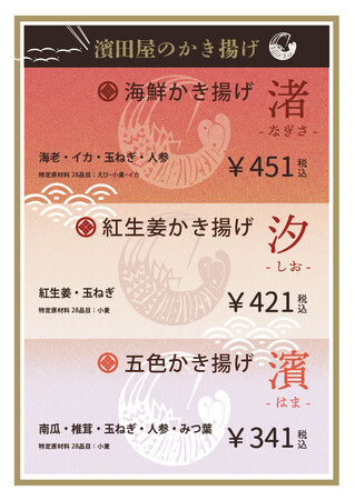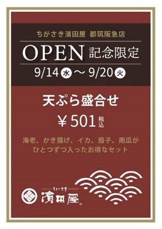 新店舗OPENを記念して、海老、かき揚げ、イカ、茄子、南瓜の5つの具材がひとつずつ入ったお得なセット 「天ぷらの盛り合わせ」を501円(税込)で限定発売いたします。旬の食材を濱田屋の天ぷらで是非ご堪能ください。