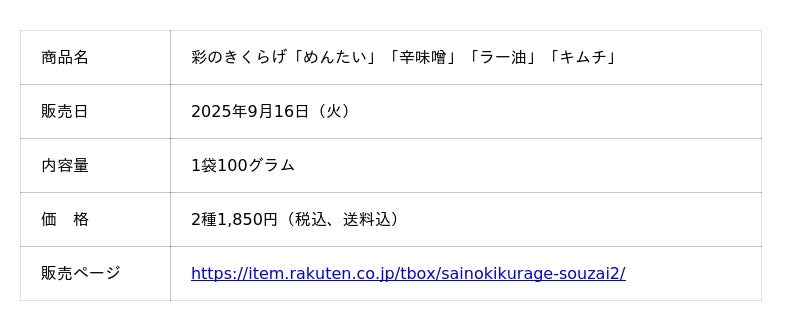 この度、シリーズ第1弾として販売を開始するのは「めんたい」「辛味噌」「ラー油」「キムチ」の4種です。いずれも、乾燥させたきくらげを使用していますが、美味しい生の食感を加工品にも生かしたいというコンセプトのもと、プリプリした食感に仕上げました。今後は第2弾、第3弾と、さらなる商品展開も予定しています。国産ならではの安心・安全と良質な味わいを両立した「彩のきくらげ」シリーズ。ぜひご賞味ください。