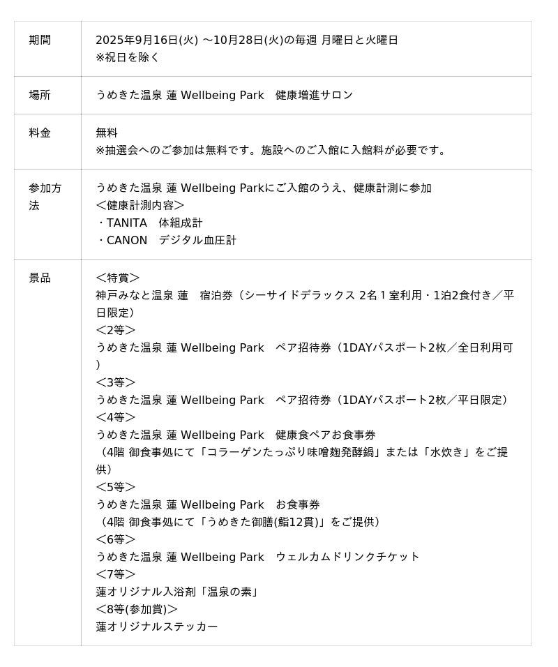 開業から半年の感謝還元として、豪華景品をラインナップ。特賞には姉妹施設である「神戸みなと温泉 蓮」のペア宿泊券をご用意。その他にも「うめきた温泉 蓮 Wellbeing Park」のペア招待券やお食事券、オリジナル商品などが当たる、はずれなしの抽選会です。
