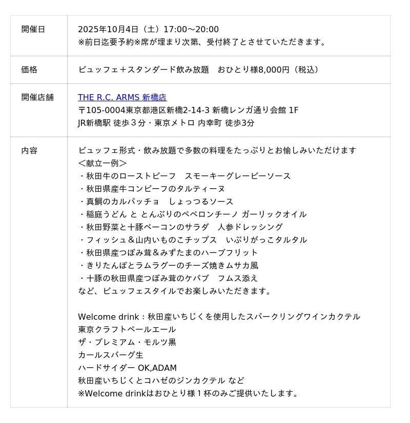 10月6日(月)より「THE R.C. ARMS」都内3店舗で実施予定の秋田フェアに先立ち、「THE R.C. ARMS 新橋店」限定で秋田県の食材を多数使用したビュッフェ料理で皆さまをおもてなしする一夜限りのコラボレーションイベントを開催いたします。