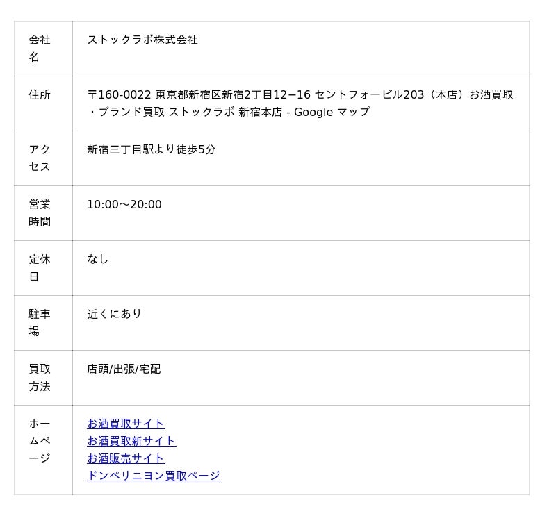 お酒買取専門店ストックラボのドン・ペリニヨン ブリュット買取の特徴を3つに分けて解説します。まずは、ストックラボの業者の概要をご確認ください。