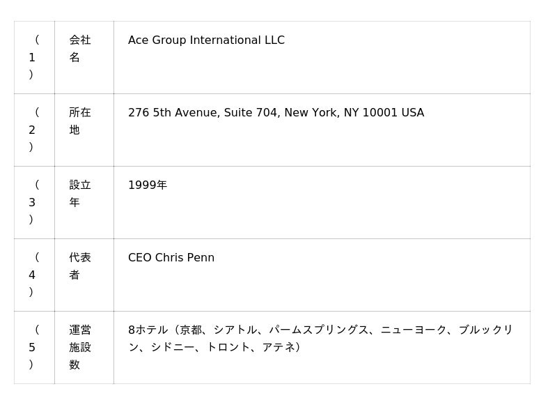 Ace Group International LLCは、ライフスタイルホテルブランド「エースホテル」を運営する会社で、現在、北米を中心に8ホテルを展開しております。「エースホテル」は、1999年に「友人のミュージシャンたちがツアー中に滞在できる場所」という創業者の思いのもと、アメリカ・シアトルで創業したホテルブランドです。「その土地の文化との共生」を重んじ、街の歴史や社会背景を踏まえたアート・音楽を軸に独創的で趣向を凝らしたインテリアデザインや地元アーティストによるイベントやワークショップを通じて活気ある創造的な場を提供することで、クリエイティブ層などから特に厚い支持を受けています。宿泊する場所としてのホテルに留まらず、誰もが訪れやすいパブリックスペースを掛け合わせ、人々が交流する、活気にあふれた創造的な空間として各都市で存在感を示しています。■会社概要