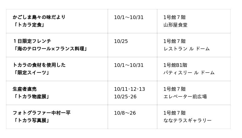 山形屋食堂では10月1日より1か月間、フランス料理のトカラ美食会は10月25日に開催します。島の魅力を写真展や物販もしながらたくさん山形屋から発信していきます。