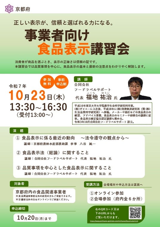 ■京都府では、府内の食品関連事業者を対象とした食品表示講習会を10月23日に開催します。