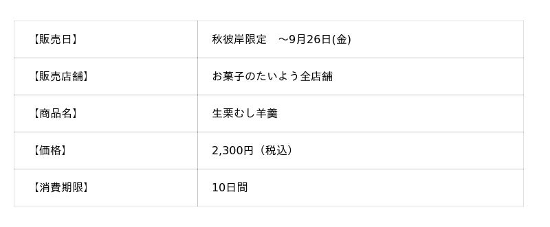 株式会社太陽社(所在地:千葉県匝瑳市飯倉293、代表取締役:片岡正裕)が展開する、千葉県で長年愛され続ける菓子店「お菓子のたいよう」では、毎年多くのお客様を魅了する秋限定の和菓子『生栗むし羊羹』が、今年も店頭に並びました。