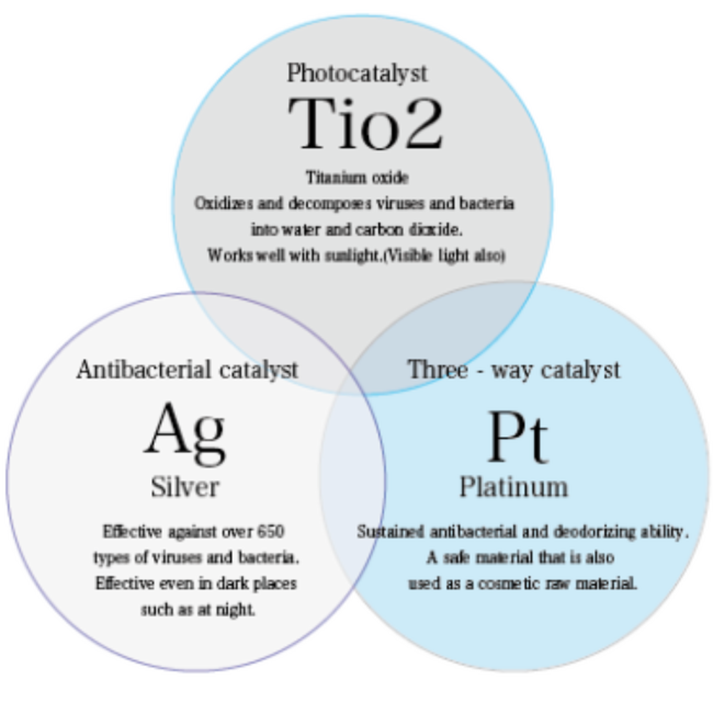 ・プラチナコロイド・・・強い抗酸化力があり、プラチナの微細な粒子が空気中のニオイの原因となる物質や菌に反応して、無臭化や分解を促進させます。自動車のマフラーに使用されています。