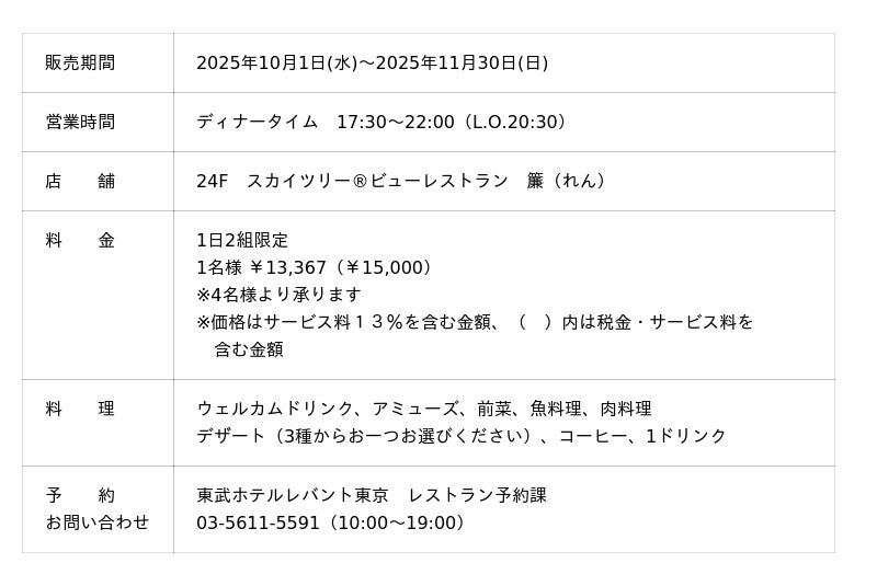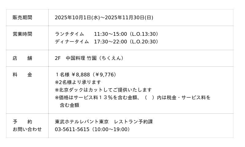 株式会社東武ホテルマネジメント(本社:東京都墨田区、代表取締役社長:三輪 裕章)の東武ホテルレバント東京(所在地:東京都墨田区)では、秋の期間限定コースとして、中国料理 竹園では「秋の感謝キャンペーン」を、スカイツリー(R)ビューレストラン 簾では「シェフが彩る秋の美食 ペアリングコース」を提供いたします。期間限定の特別メニューをぜひお楽しみください。