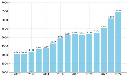 日本アイスクリーム協会によると、2024年のアイスクリーム販売金額(メーカー出荷ベース)は前年比6.1%増の6,451億円、販売物量は前年比3.1%の935,916kL*2でした。販売金額は5年連続で過去最高、販売物量は歴代2番目となります。また、一世帯当たりの年間支出金額も前年比6.2%増の12,295円と過去最高で、5年連続1万円超を記録しています*3。消費量・支出ともに増加傾向にあることから、この増加は物価高による食品価格高騰の影響だけでなく、実際にアイスクリームを食べる量自体が増えていることを示しています。