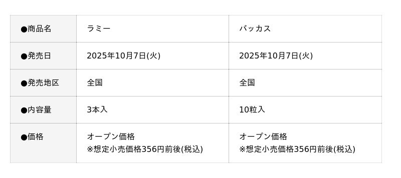 株式会社ロッテ(東京都新宿区、代表取締役社長執行役員:中島英樹、以下ロッテ)は、2025年10月7日(火)に、洋酒チョコレート市場売上No.1(※1)で、発売60周年を迎える「ラミー」と、「バッカス」を冬季限定で発売いたします。さらに、昨年好評だった「カスタードケーキ<バッカス仕立て>個売り」は洋酒使用量が20%アップ(※2)にバージョンアップして今年も発売いたします。この時期ならではの味わい、チョコレートとお酒の絶妙なハーモニーで、優雅な気分と贅沢な時間をお楽しみください。