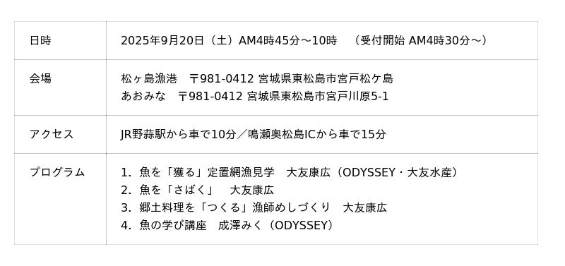 一般社団法人 海のごちそう推進機構と一般社団法人ODYSSEYは、魚を実際にさばくこと、地域の海洋変化や魚種の変遷を学ぶこと、さらに地域の郷土料理に根差した調理体験など、日本の豊かな海の食文化を継承し輪を広げる取り組み「日本さばける塾 in 東松島」を9月20日(土)に開催いたします。