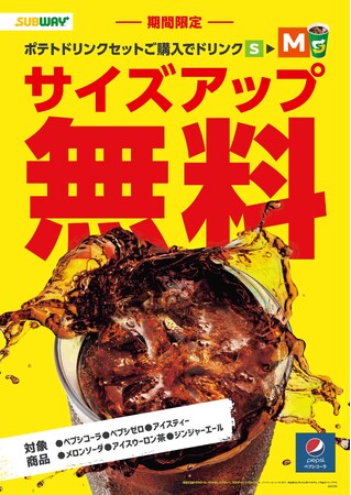 真夏でも頑張る皆様に、サブウェイから応援キャンペーンをお届けします。サンドイッチの『ポテトドリンクセット』をお求めいただいたお客様のドリンクをSからMヘ無料でサイズアップ。お好みのサンドイッチと一緒にご利用ください。