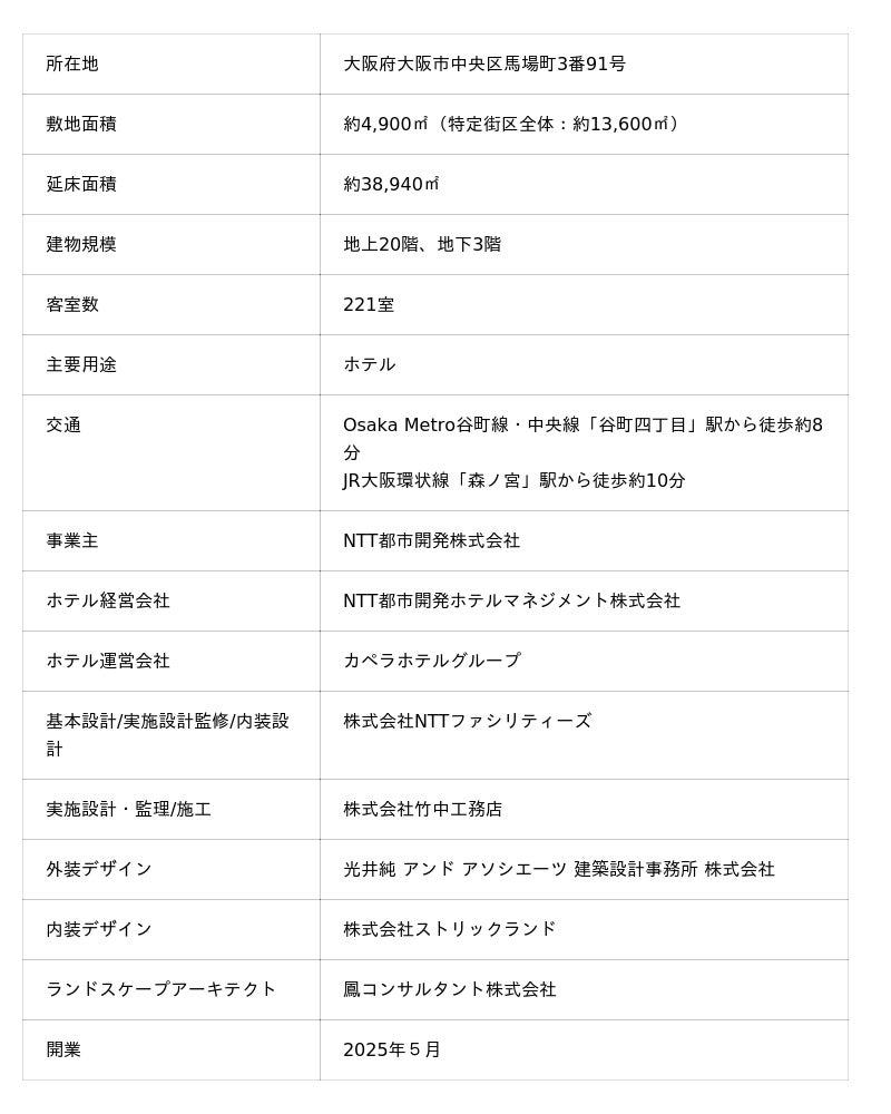 NTT都市開発株式会社(本社:東京都千代田区、代表取締役社長 池田 康、以下「NTT都市開発」)が開発・所有し、グループ企業でホテル経営会社であるNTT都市開発ホテルマネジメント株式会社(本社:東京都千代田区、代表取締役社長 松本 順一)が経営する、2025年5月に開業した「パティーナ大阪」(カペラホテルグループ運営、総支配人 エレン・フランケ)が、「AHEAD Awards ASIA 2025」において「スイート客室部門賞」を受賞したことをお知らせします。
