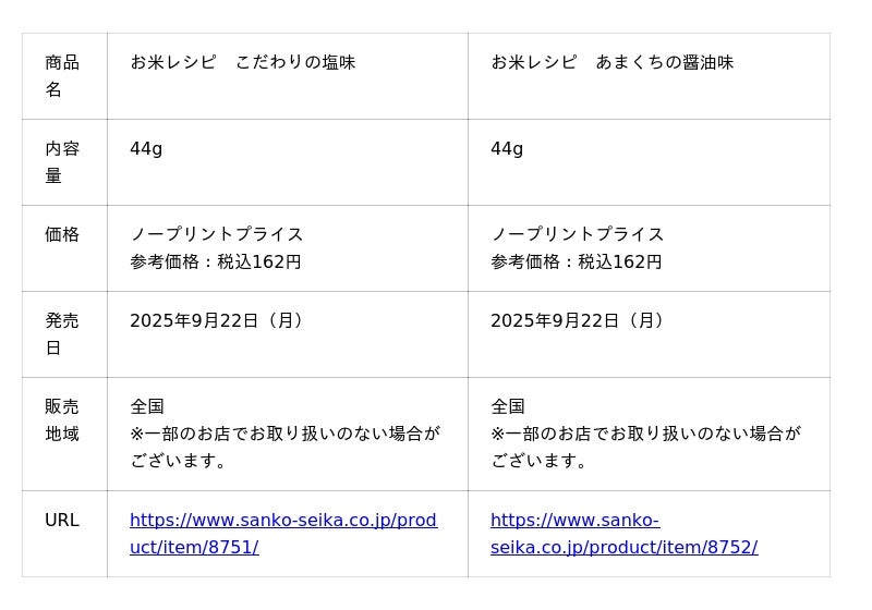 「お米レシピ」は、原料のお米のおいしさを引き立てる「こだわりの塩味」と「あまくちの醤油味」に仕上げました。王道かつシンプルながら深みのある味わいは、ついつい手が止まらなくなるおいしさです。