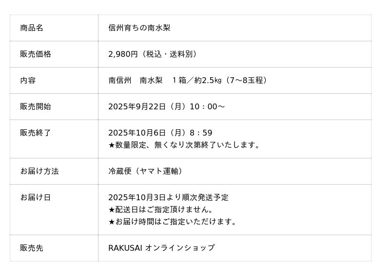 楽彩株式会社(本社:東京都足立区/代表取締役社長:大崎善保)は、強い甘みとシャリッとした食感が特徴の「信州育ちの南水梨」を、2025年9月22日(月)10:00より公式オンラインショップにて販売開始いたします。