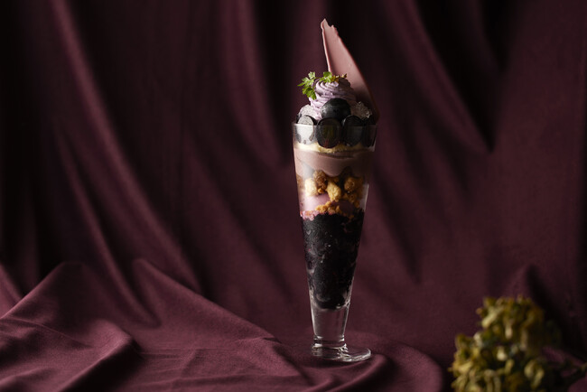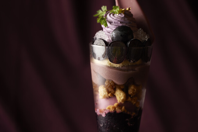 最下層には上品な味わいと口どけの良い「ぶどうゼリー」を敷き詰め、爽やかな「巨峰のシャーベット」、甘みが凝縮した「レーズン」、サクサクとした食感がアクセントになる「サブレ」、パープルの美しさが際立つ「巨峰のカスタードクリーム」を重ねました。その上にしっとりとした食感の「ジェノワーズ」と甘みと酸味のバランスが絶妙で濃厚な味わいの「巨峰」、コクのある風味豊かな「巨峰のシャンティクリーム」を乗せ、旬の巨峰を存分にご堪能いただけるようにいたしました。トップには、パープルの世界観に合わせた「紫チョコレート」「シロップゼリー」に華やかな金粉とセルフィーユを飾った、鮮やかなパープルが映える大人っぽい雰囲気を演出したパフェです。