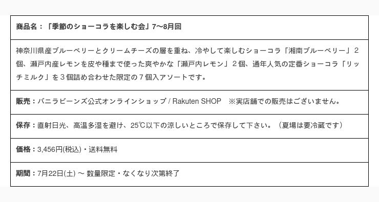 チョコレートデザイン株式会社(代表取締役:八木克尚、本社所在地:横浜市)が運営するブランドVANILLABEANS(バニラビーンズ)は、オンラインショップ限定のカジュアルアソート「季節のショーコラを楽しむ会」の7~8月回を7月22日(土)から数量限定で販売します。「ショーコラ」とは弊社を代表する、フェアトレードチョコレート使用の生チョコレートサンドです。今回のアソートは果実を使った、冷やして楽しむショーコラを太陽のような明るいパッケージで包みました。