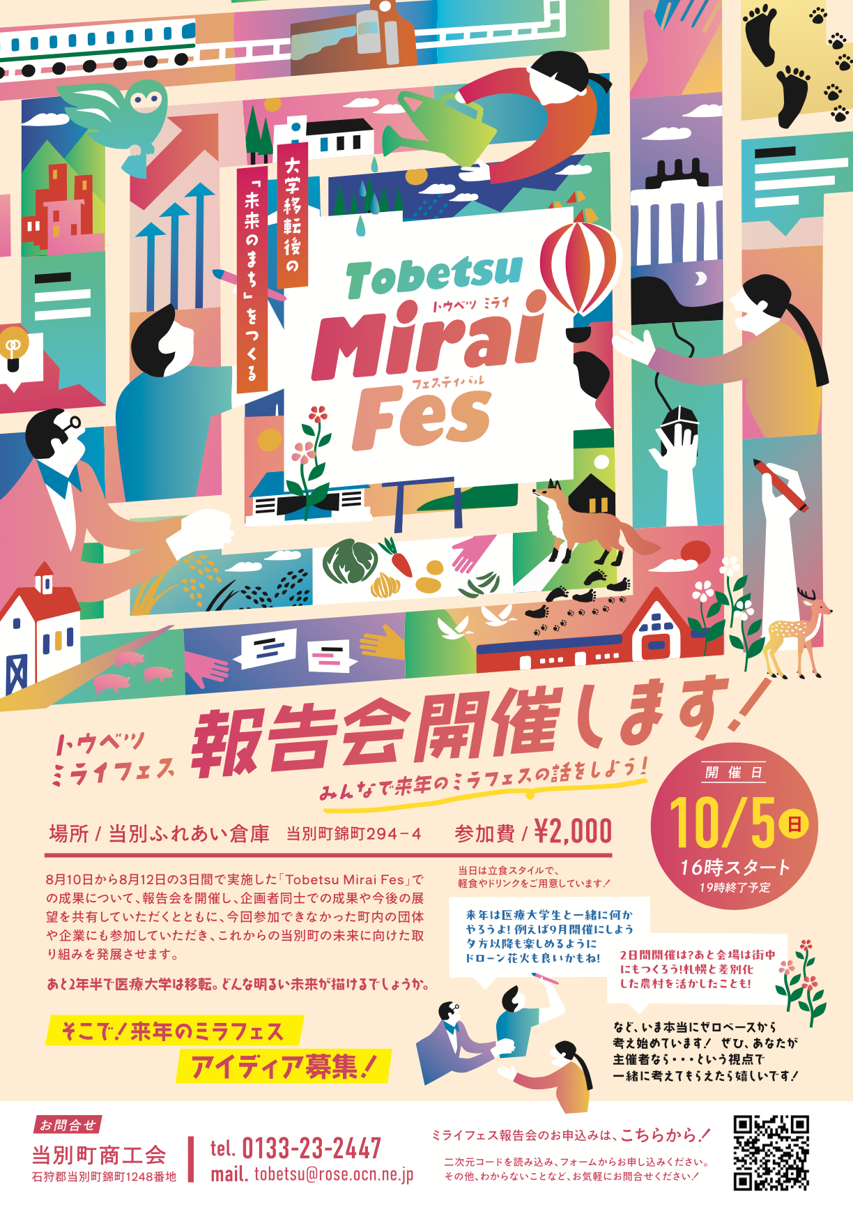 8月10日~12日の3日間開催された【トウベツミライフェス 】 。大学移転のピンチをチャンスに。明るいビジョンと行動でポジティブな未来を創造するためのイベントとして、延べ1,000名以上の方が来場!「消滅可能性都市」の中で、「特に深刻(全国で23自治体)」と言われる人口1万5000人の小さな町から大きなエネルギーが生まれました。イベント期間中は、ありがたいことに多くの取材依頼があり、テレビ・雑誌等でも取り上げていただきましたが、このたび、成果発表や来年に向けての報告会を開催いたしますので、事後取材を含め、是非ご参加ください!当日は、立食スタイルで軽食やドリンクをご用意していますので、わいわいと楽しい雰囲気でディスカッションできればと考えております。
