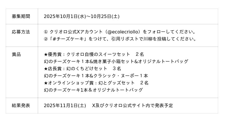 「幻のチーズケーキ」をお題に、20周年記念の川柳コンテストをX(旧Twitter)で開催いたします。