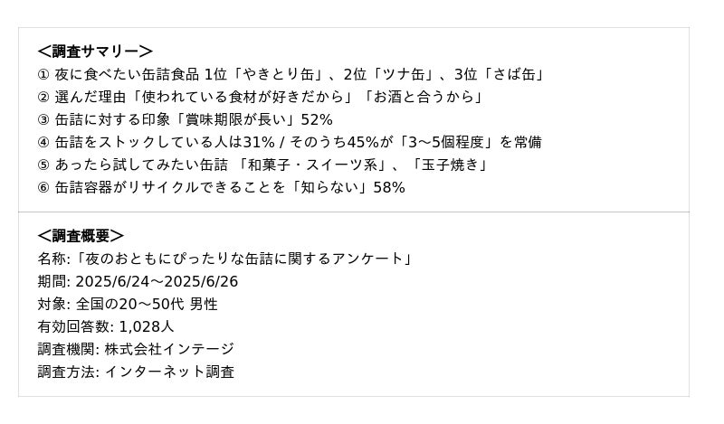 総合容器メーカー、大和製罐株式会社(本社:東京都千代田区丸の内、代表取締役社長:山口裕久)は、20~50代の男性1,028人を対象に「夜のおともにぴったりな缶詰」にまつわるアンケートを実施しました。本リリースでアンケートの結果を発表します。