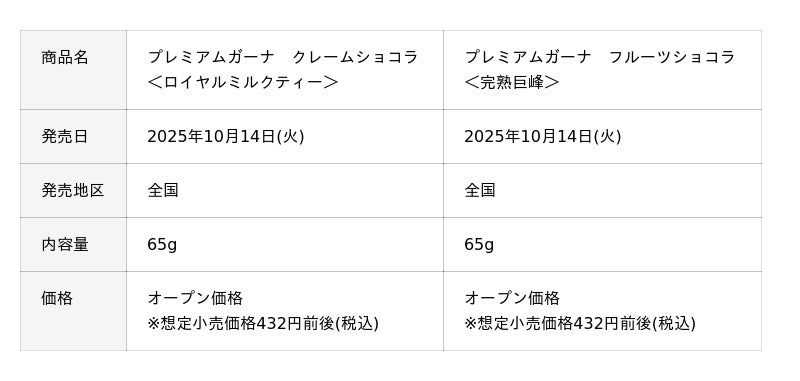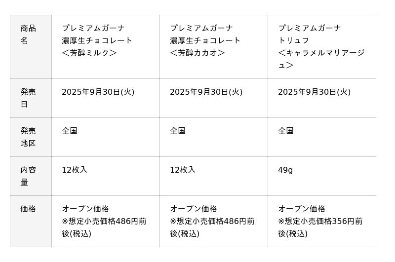 濃厚な味わいとすっととろける繊細なくちどけが楽しめる「濃厚生チョコレート」、2種のキャラメルを使用し、上品な甘さと香ばしさを楽しめるように仕上げた「トリュフ<キャラメルマリアージュ>」を9月30日(火)に、昨年大変ご好評いただいたフルーツショコラ<完熟巨峰>と、世界三大銘茶「ウバ茶」を使用し、華やかで香り高い茶葉の風味を感じる「クレームショコラ<ロイヤルミルクティー>」を10月14日(火)より発売します。また、2種アソートの徳用商品として「ショコラセレクション」を10月21日(火)より発売します。
