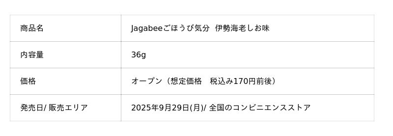 カルビー株式会社(本社:東京都千代田区、代表取締役社長兼CEO:江原 信)は、じゃがいもの味わいと独自の食感が楽しめる「Jagabee」より、新シリーズ「ごほうび気分」の展開を始めます。第1弾として、香ばしく焼いた伊勢海老※1の風味が楽しめる『Jagabeeごほうび気分 伊勢海老しお味』を2025年9月29日(月)から、全国のコンビニエンスストア限定で発売します(同年11月上旬終売予定)。