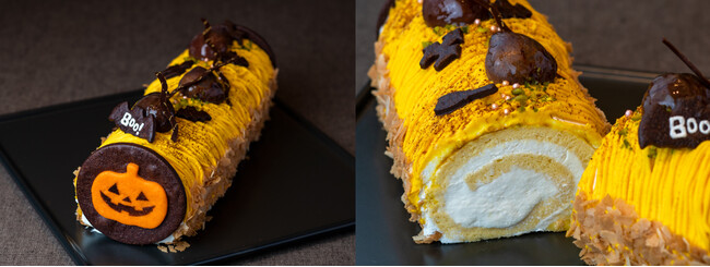 ふわふわのスフレ生地にメープル風味のクリームを包んだロールケーキを、かぼちゃのクリームとチョコレートでデコレーション。ハロウィーンのモチーフを詰め込んだコワ可愛いケーキに仕上がっています。