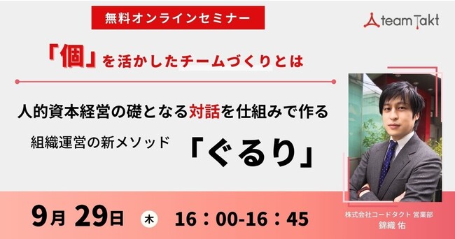 株式会社コードタクト(本社:東京都渋谷区、代表取締役:後藤正樹、以下「当社」)のジョブトレーニング支援クラウド「チームタクト」は、企業の組織開発・人材育成担当者に向けた無料オンラインセミナーを9月29日(木)に開催します。 「人的資本経営の礎となる対話を仕組みで作る組織運営の新メソッド『ぐるり』」と題した本セミナーでは、業務における個人の内省を心理的安全性を確保した対話の場で共有する仕組みを設け、個人の成長と組織の共創を生み出す新メソッド「ぐるり」の概要をお伝えします。 また、当日はチームタクトを活用した「ぐるり」の実践を一部体験いただく時間も設けます。本メソッドの効果や運営イメージを、ご自身の体験としてお持ち帰りいただくことができます。セミナー詳細・お申込:https://teamtakt.biz/news/p8fOVjw_