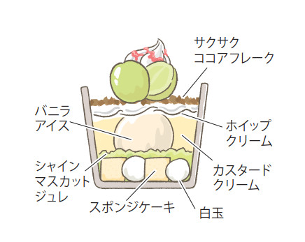 シャインマスカットとの相性抜群な、バニラシードを使用した香り豊かなカスタードクリームや、バニラアイスや白玉などお楽しみが隠れています!!
