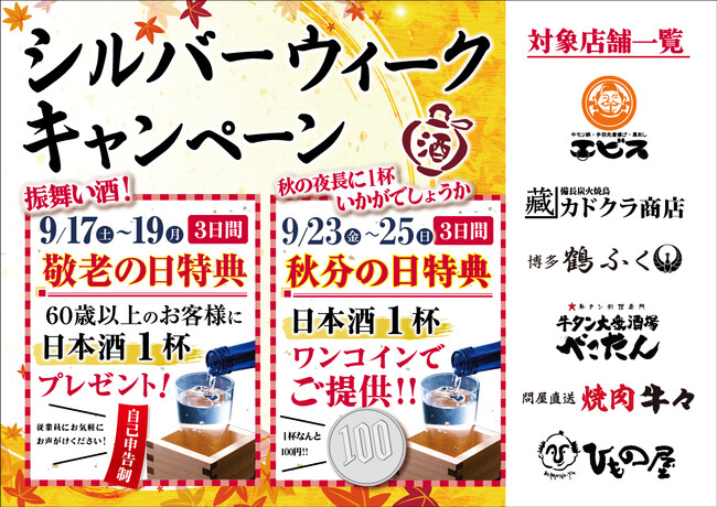 こちらの日本酒を、シルバーウィーク後半の9月23日(金・祝)"秋分の日"で始まる連休3日間にも、1杯100円でご提供させていただくワンコインサービスも実施いたします。今年のシルバーウィークには、ぜひ対象店舗で秋の夜長と共に日本酒をお楽しみください。