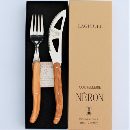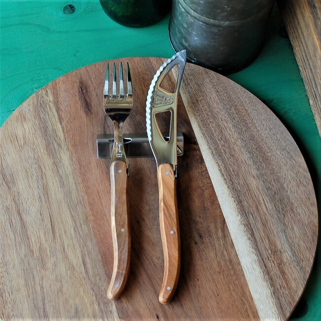 独特のブレード形状とNERON社独自のセレーション(波刃)を持つピザナイフと欧州仕様の磨き仕上げなしのディナーフォークをSETにしました。 ピザ以外でも様々なものをカットできるカトラリーセットです。