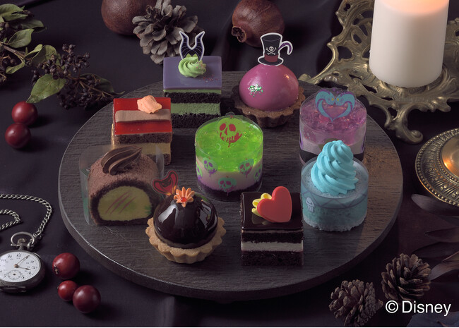 「ディズニーヴィランズ」(悪役)の魅力を9つのプチケーキで表現しました。見て食べて楽しいプチケーキはハロウィン気分を盛り上げること間違いなし!