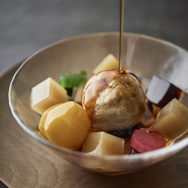今年採れた国産の栗を使って仕立てた栗餡をはじめ、自家製の寒天や栗水羊羹、蜜栗、えんどう豆などをのせた秋限定のあんみつ。白蜜か和三盆糖蜜を選ぶことができ、秋ならではの味わいを引き立てます。