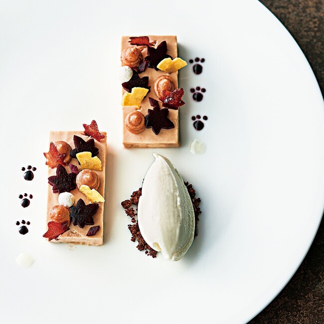 心地よい甘さのマロンクリームにカシスの求肥とフランボワーズのクロッカンを添えたモンブラン仕立てのひと皿。多彩な素材をアレンジして、楽しい食感と色づく秋の散歩道のイメージを叶えた季節感漂う大人のデセール。