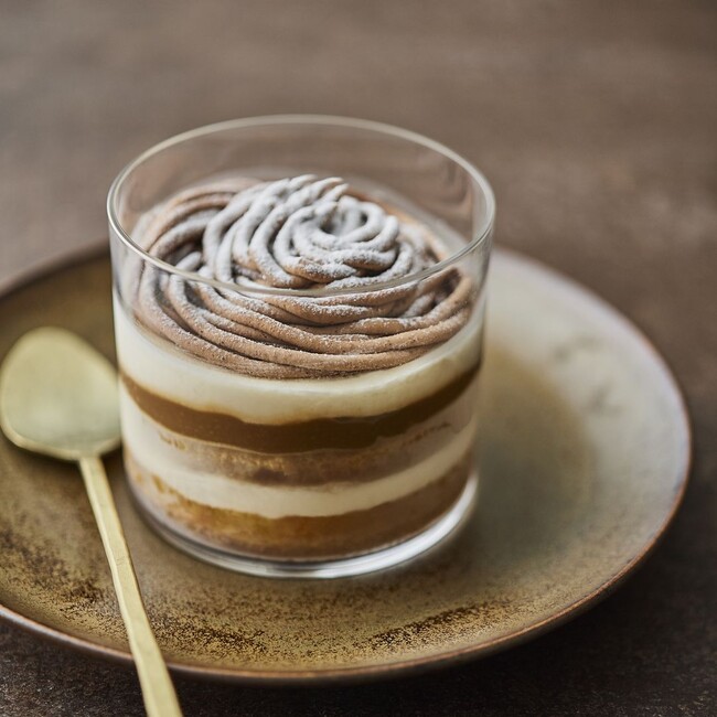 マロンクリームとマスカルポーネクリームのティラミスは、ほうじ茶シロップの香ばしさとキャラメルソースのほろ苦さ、オレンジのコンフィチュールの酸味がアクセント。こっくりと濃厚な味わいを軽やかな口溶けで楽しみたい。