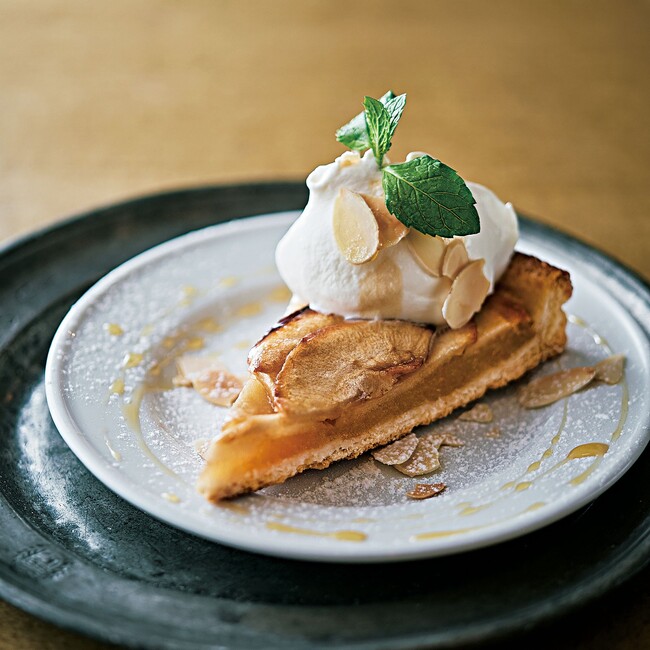 身体にやさしいスイーツにこだわり、原材料は自然由来のものだけを使用。ピューレとスライスにしたりんごの甘酸っぱさをサクッとした素朴な甘みのタルト生地が引き立てます。アクセントにアーモンドスライスとホイップを添えて。