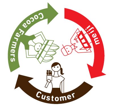 メイジ・カカオ・サポートは、2006年に始まった株式会社 明治独自の「カカオ農家支援活動」です。2026年度までにサステナブルカカオ豆の 調達比率100%を目標として、現地農家のさまざまな課題に合わせたサポートを行っています。こうした活動を積み重ね、また適切な価格で継続購入することによって持続可能なカカオ生産にも貢献 しています。同社はそのカカオ豆を使用してつくりあげたチョコ レートを、日本中の生活者に身近な場所で、手頃な価格でお届け することで、生活者もカカオ産地の方々も、すべての人がうれしいチョコレートであるように、いい循環を創出することに取り組んでいます。