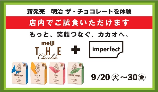 世界の食と農を取り巻く社会課題の解決にお客様と一緒に取り組む「Do well by doing good.」(=いいことをして世界と社会をよくしていこう)活動を展開するウェルフードマーケット&カフェ「imperfect(インパーフェクト)表参道」店舗内で、株式会社 明治の「もっと、笑顔つなぐ、カカオへ。」をテーマにしたポップアップを9月20日(火)~30日(金)の期間で実施致します。